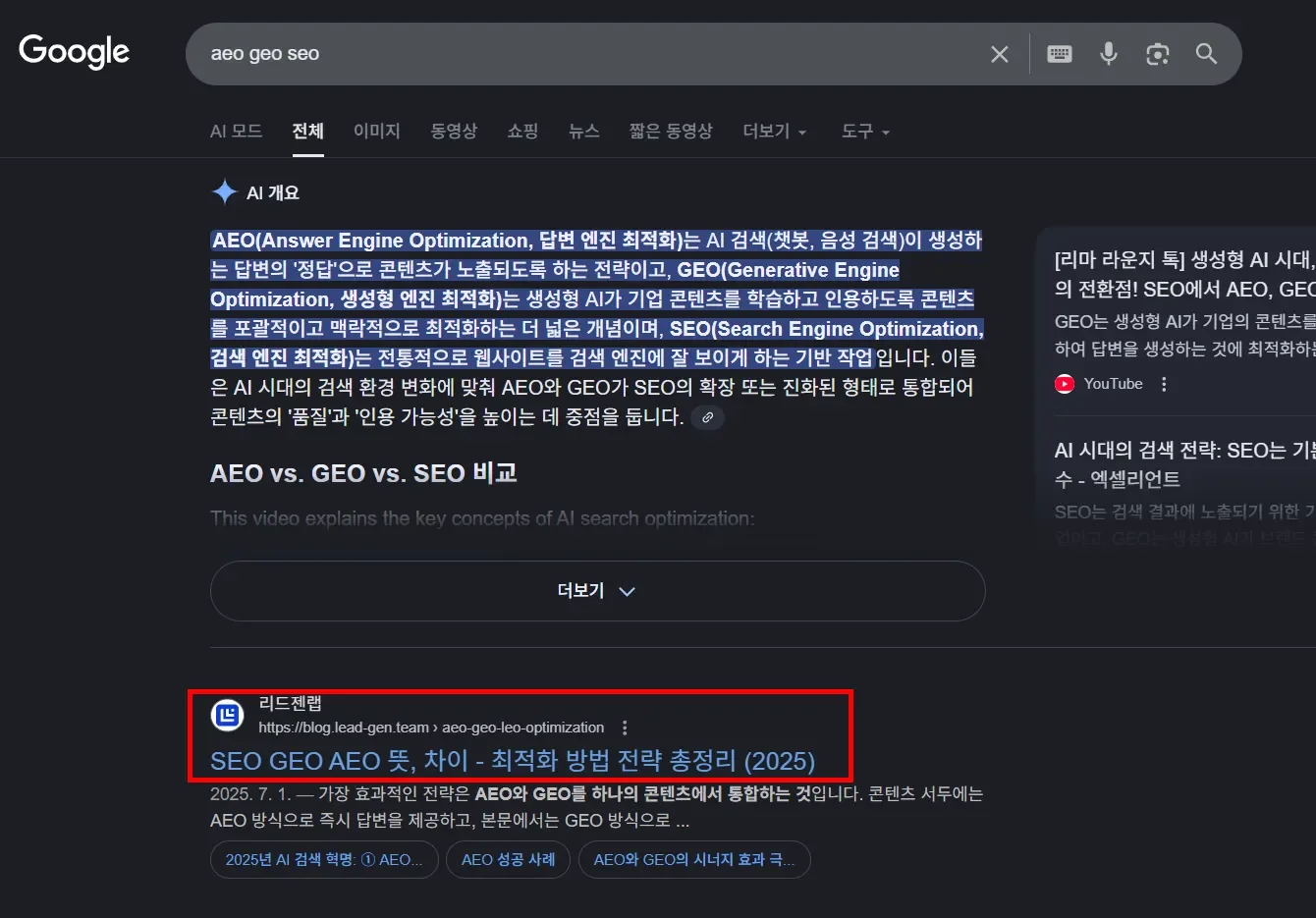 AEO(답변 엔진 최적화)는 구글의 AI 요약(AI Overview)에 콘텐츠가 선택되도록 최적화하는 방식입니다. 기존 SEO가 링크 클릭을 유도하는 것이었다면, AEO는 클릭 전에 AI 요약 답변 안에서 먼저 보이는 것입니다.