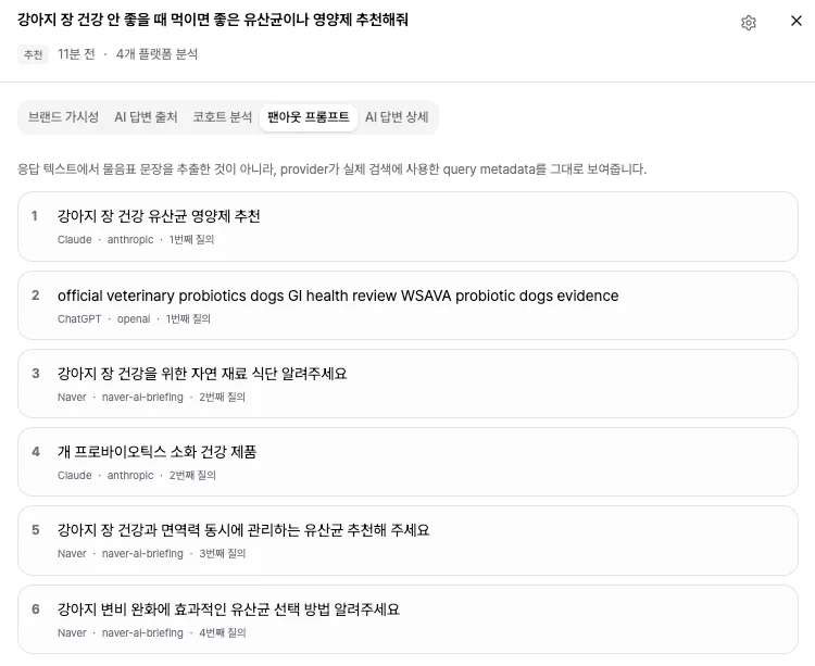 리드젠랩이 개발한 AI 답변 최적화 자동화 툴에서는 각 LLM이 프롬프트별로 쿼리 팬아웃을 어떻게 하는지를 모두 트래킹할 수 있습니다.